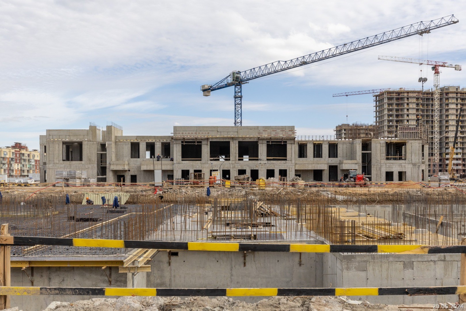 Детский сад. Ведутся монолитные работы на уровне кровли. Начаты работы по кладке внутренних стен на 1 этаже.