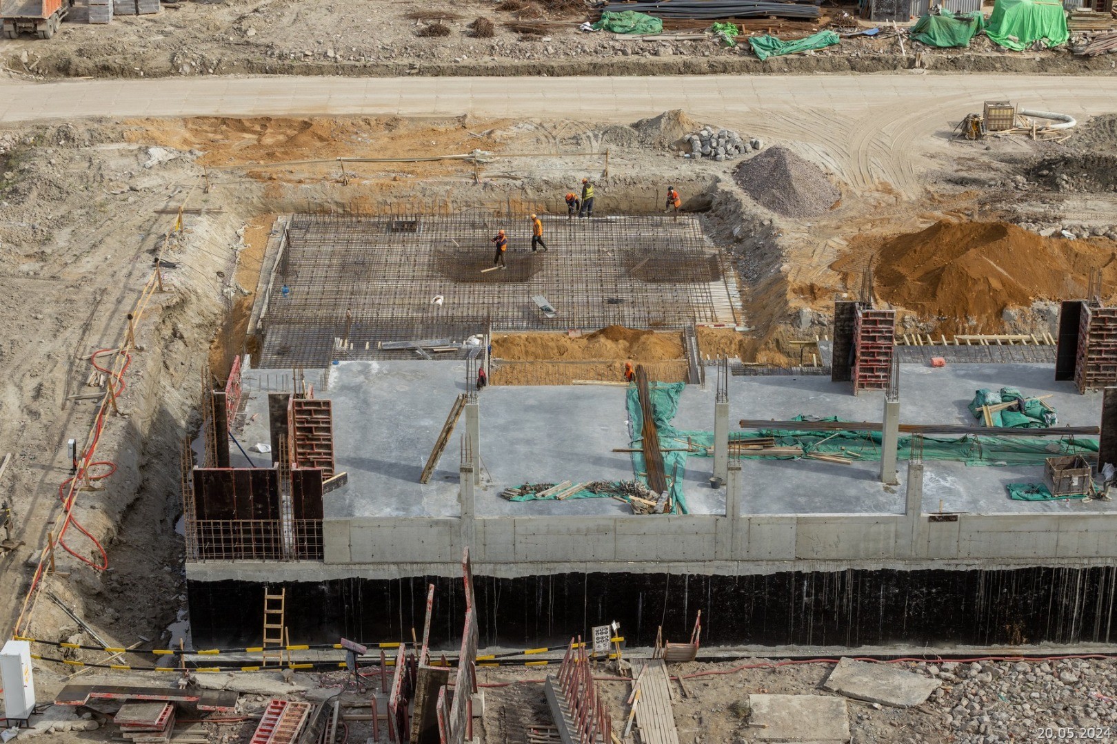 Корпус 10 (паркинг). Ведутся монолитные работы на уровне цокольного этажа: бетонирование стен, армирование плиты перекрытия.