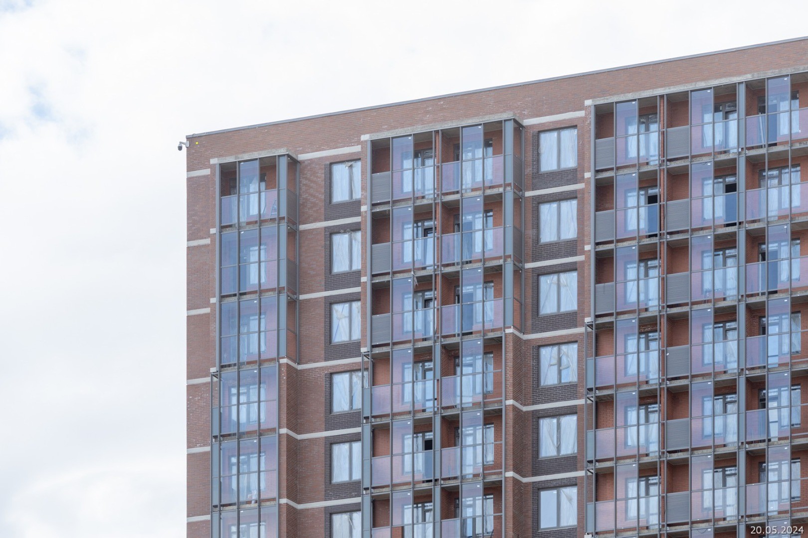 Корпус 4. Работы по устройству холодных витражей выполнены на 60%. Продолжаются штукатурные работы и стяжка пола в квартирах и МОП.