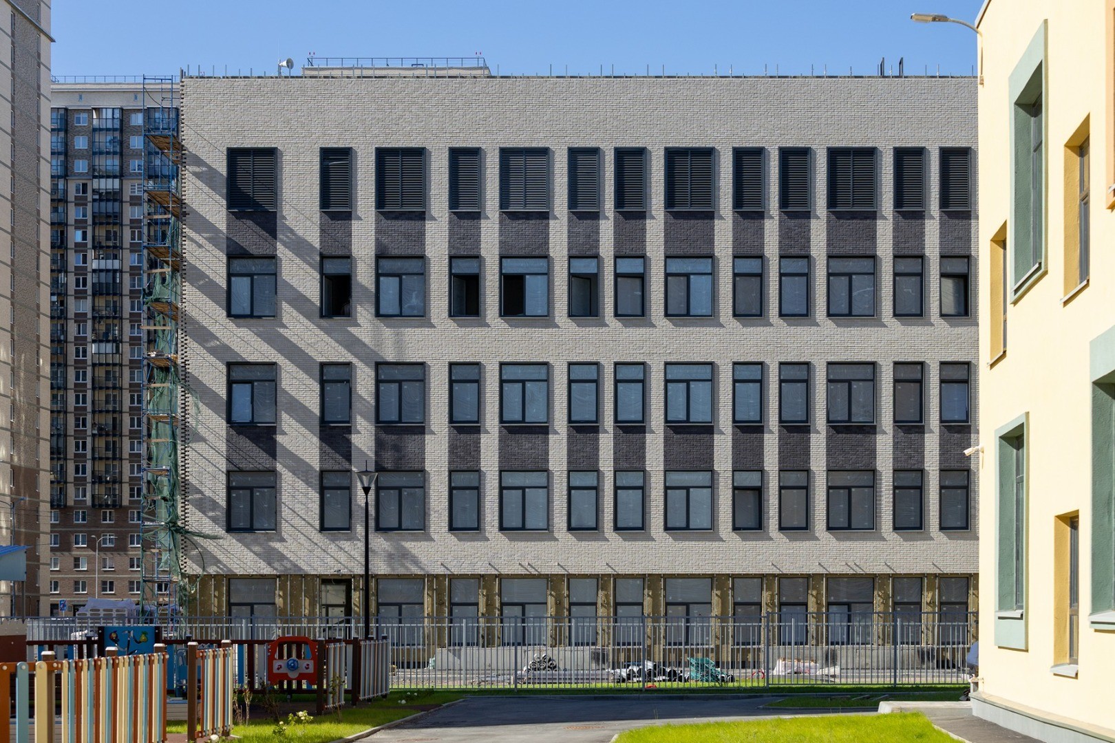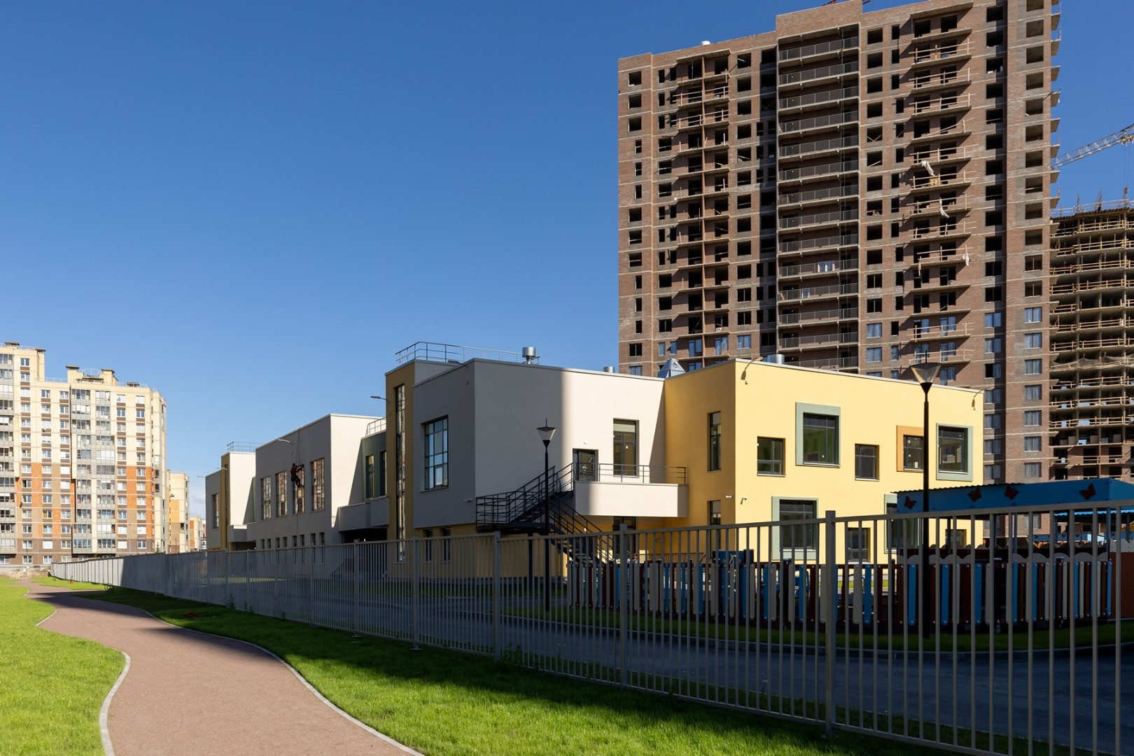 Детский сад. Чистовая отделка – закончена. Проводится пуско-наладка оборудования бассейна и слаботочных систем. Продолжаются работы по благоустройству прилегающей территории: озеленение, укладка тактильной плитки.
