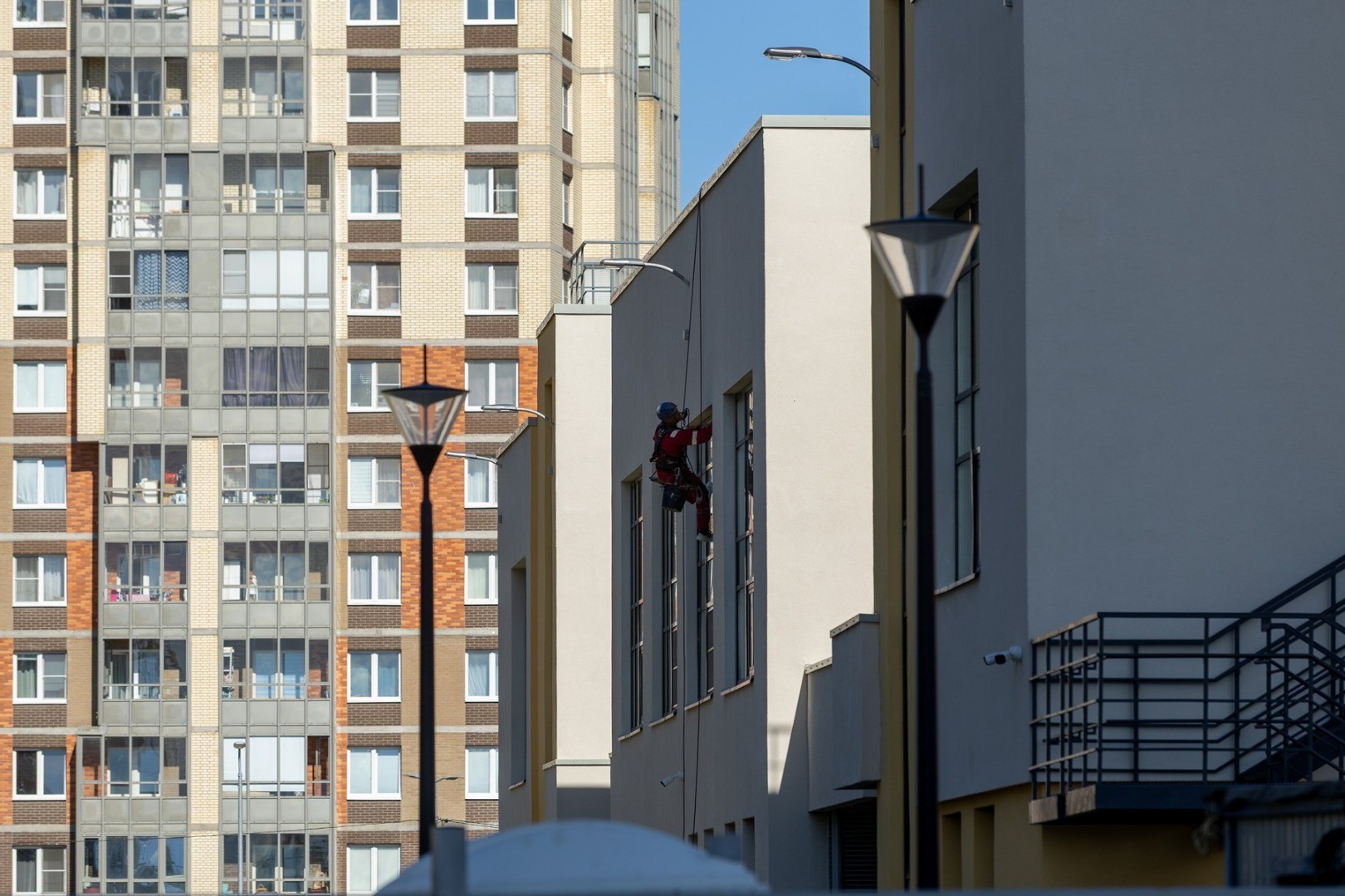 Корпус 5. Монтаж витражей выполнен на 80%. Ведется черновая отделка (оштукатуривание стен, устройство стяжки, облицовка откосов) и чистовая отделка (укладка плитки в санузлах, установка подоконных досок).