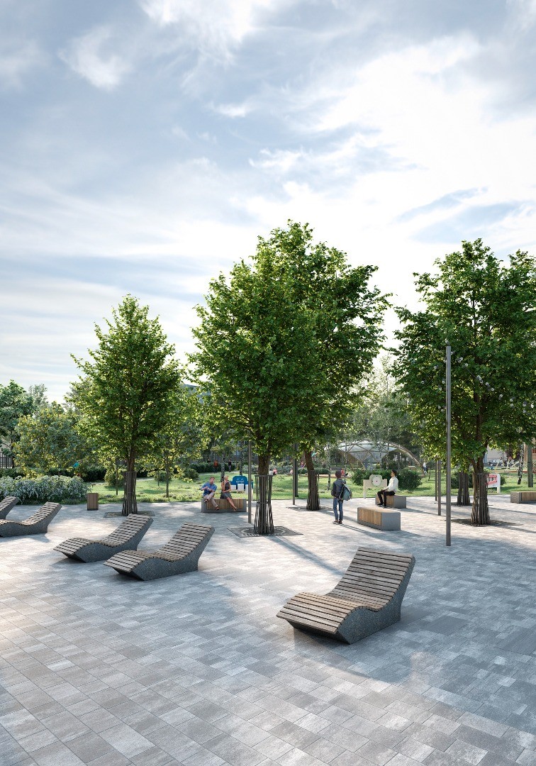 Рельеф общественной зоны дополнен геопластикой. Зеленые насыпные холмы будут покрыты натуральным газоном, здесь же будут высажены взрослые деревья и кустарники.